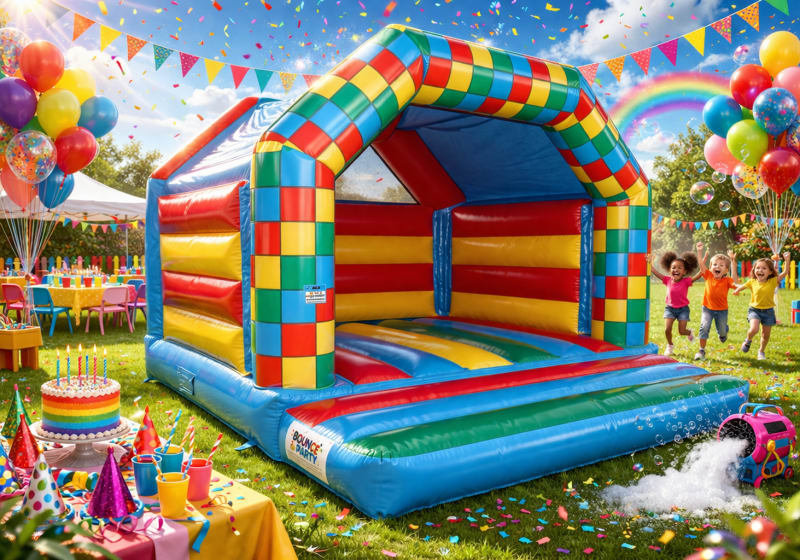 15 x 15 ft multi coloured castle. Ideal for indoor and outdoor venues. This colourful bouncy castle is sure to add a splash of colour to any garden.
