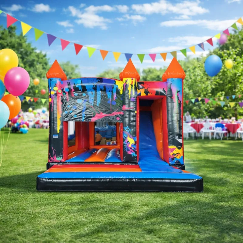 Our Paint Splat -themed bouncing combi unit features a fully enclosed spacious bouncing area with a slide to the side for added fun.